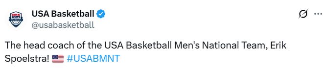 “我代表美国篮球协会董事会,欢迎埃里克-斯波尔斯特拉担任美国男篮国家队主教练,”美国篮球协会主席、退役将军马丁-登普西表示,“埃里克在NBA和国际篮球赛事中都证明了自己的夺冠能力,同时他也是一位极具天赋的领导者。我们感谢他愿意为美国篮球协会和国家接受这一挑战。”
