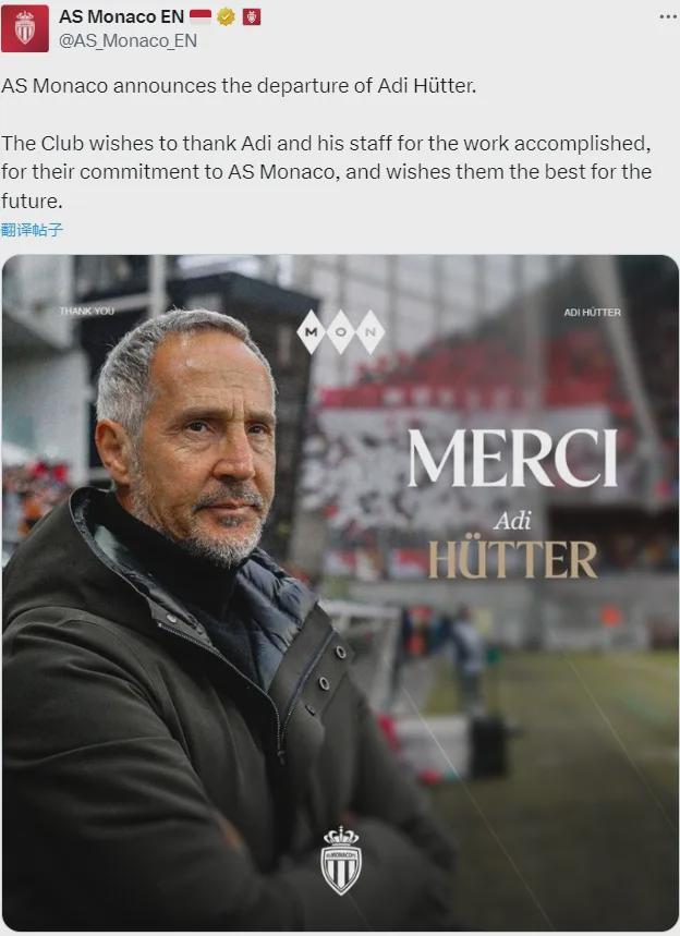 官方:摩纳哥宣布解雇了阿迪-胡特。