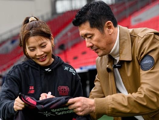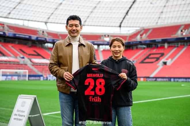杨晨到访勒沃库森主场拜耳竞技场,沈梦露接待并陪同参观